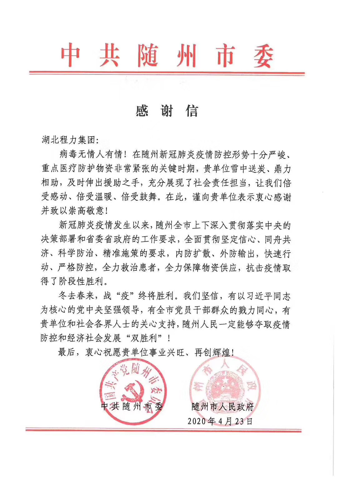 4月27日,程力公司繼國務(wù)院感謝信點贊鼓勵后,又收到了來自隨州市委、市政府署名的感謝信,表揚(yáng)程力公司在防控疫情期間的社會責(zé)任擔(dān)當(dāng),這是全體程力家人們共同的榮譽(yù),我們堅信在黨中央國務(wù)院,省委省政府,市委市政府的領(lǐng)導(dǎo)下,一定能夠奪取疫情防控和經(jīng)濟(jì)社會發(fā)展"雙勝利"。